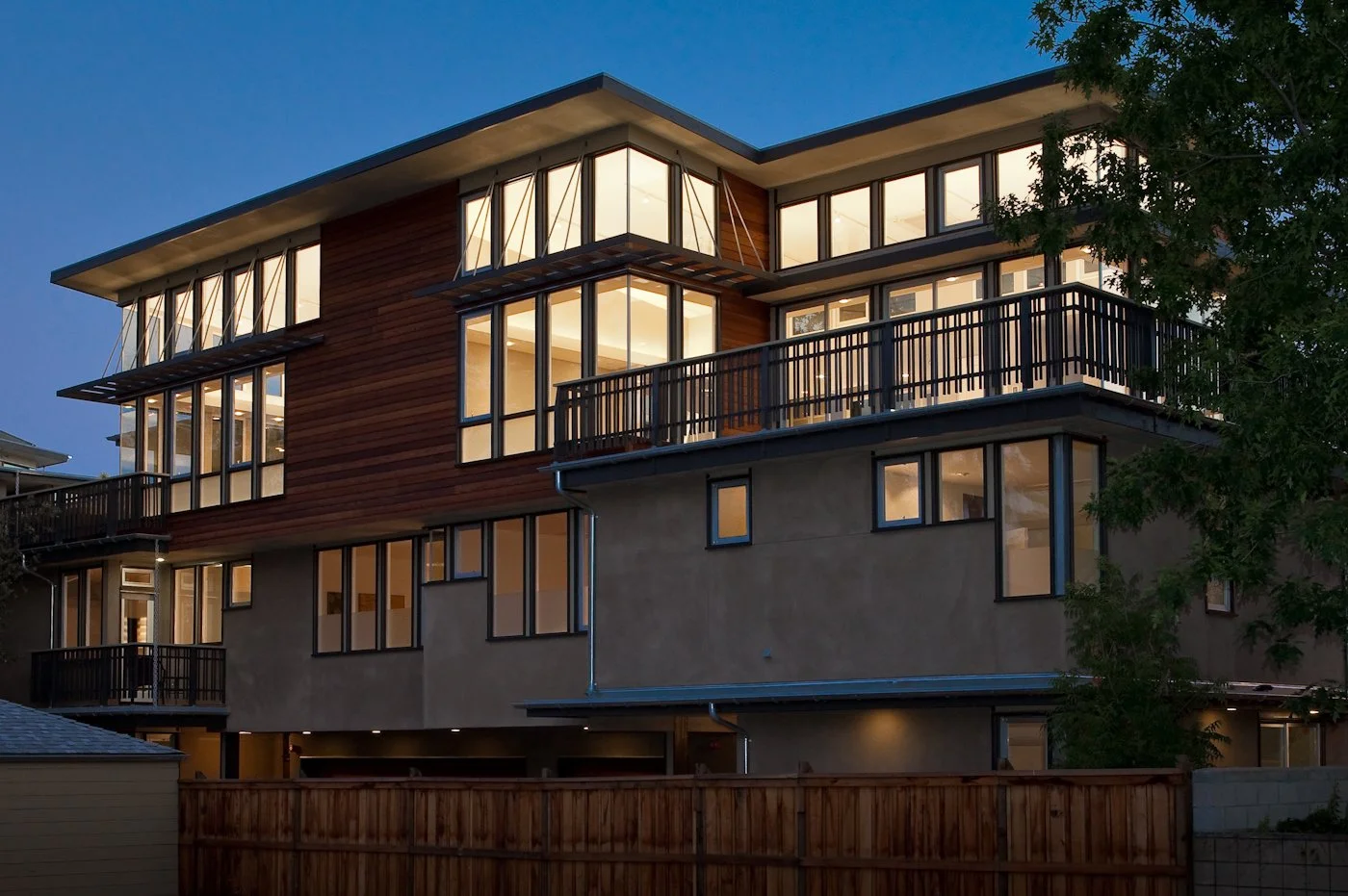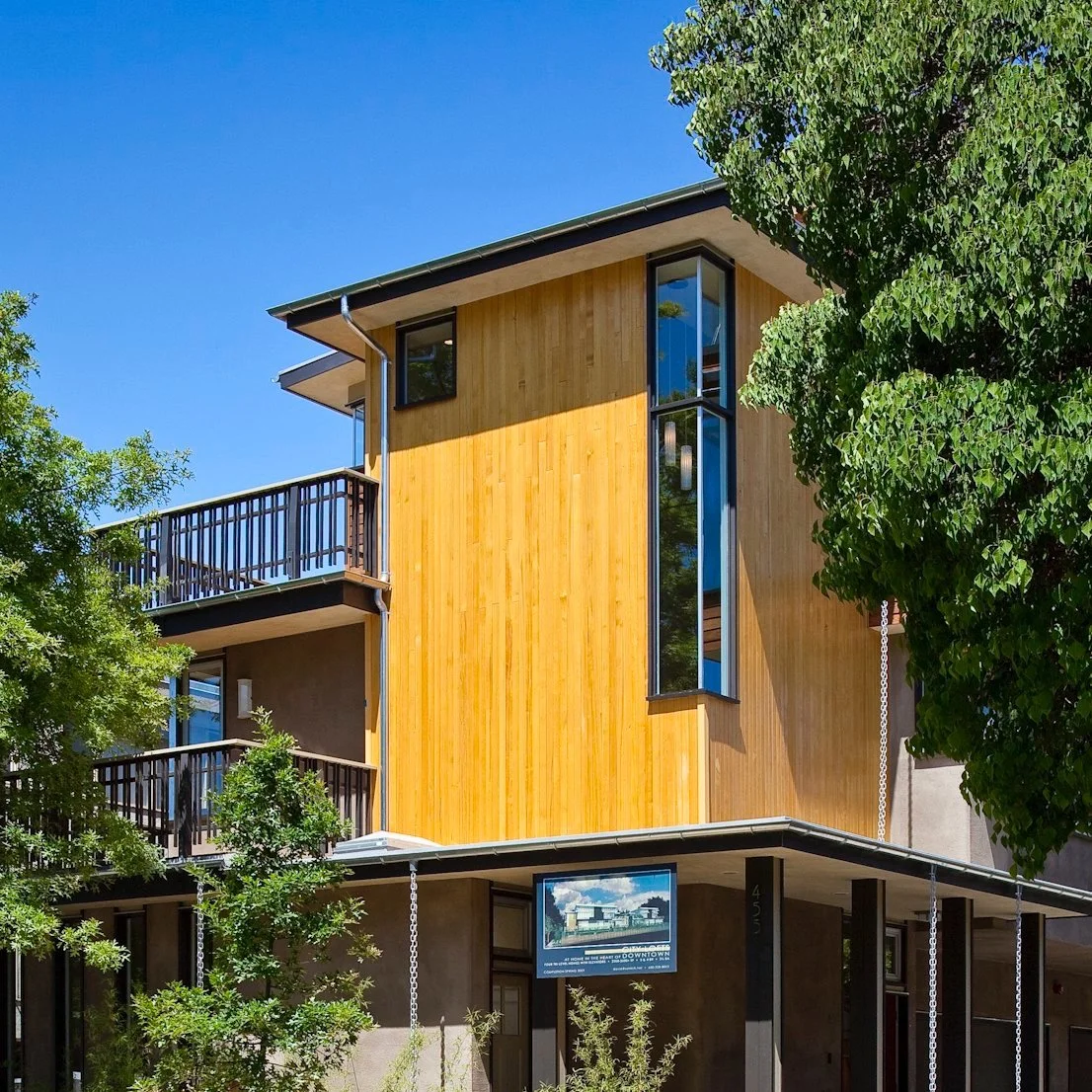 Upscale and uplifting modern dwelling in the walkable downtown of a small town. Four 3-story townhomes each with a private elevator to reach sunlit top-floor lofted Great Rooms hovering above the narrow site. Second floor bedrooms over ground floor flex space for work, hobby, recreation, or separate dwelling.